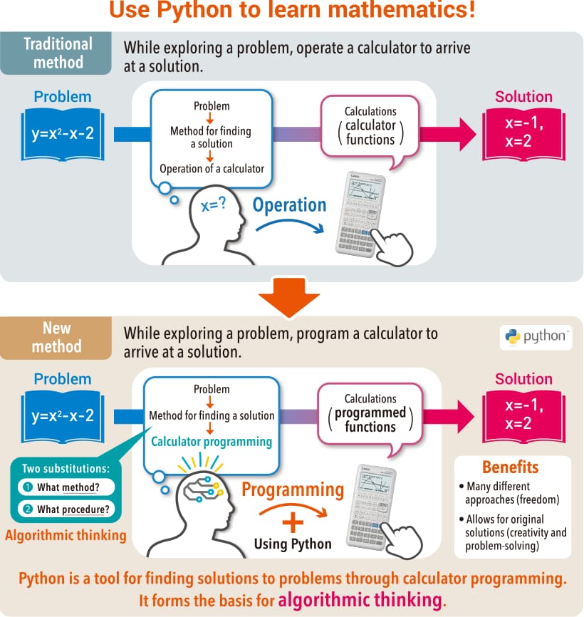 The fx-9860GIII comes built-in with Python, a programming language used in the development of Internet search engines, social media sites, robots, etc.