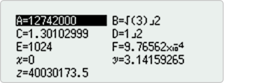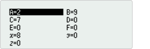 You can store values to variables and use the variables in calculations. Pressing [variable] displays a screen that shows the values currently stored to variables A, B, C, D, E, F, x, y and z.
