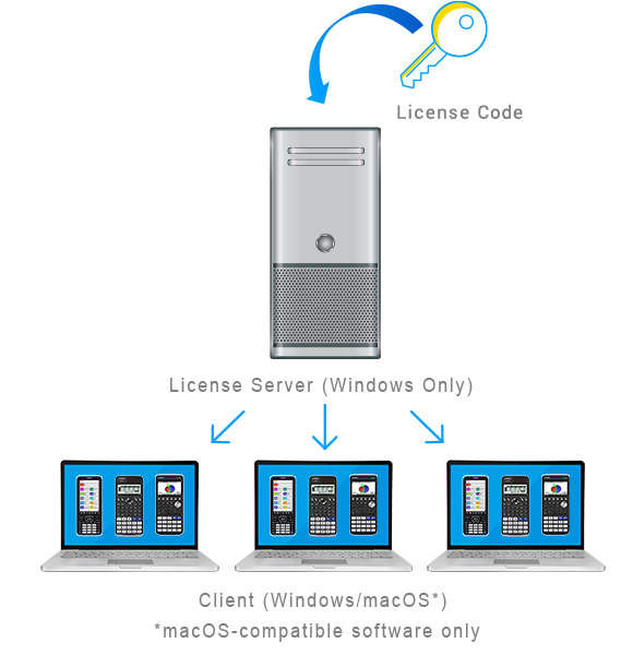 The PC that manages all of the licenses is known as the license server, and the PCs that use the calculator software are known as the clients.